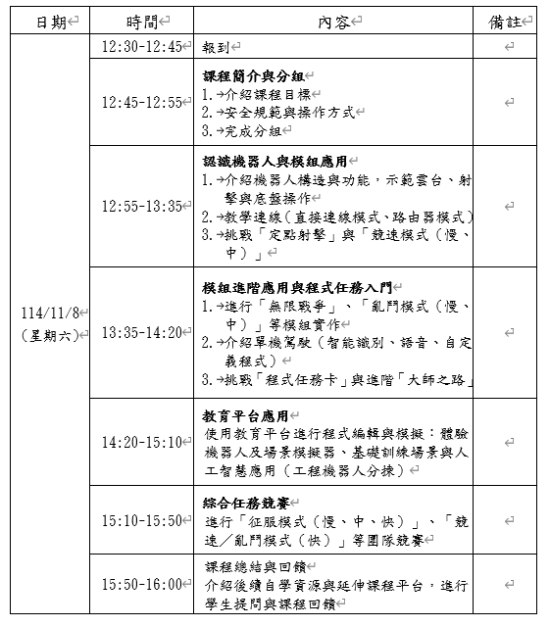 | 二、 | 營隊時間: 114 年 11 月 8 日(星期六) 12:45~16:30 。 |