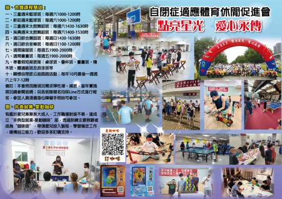 二、 | 社團法人中華民國自閉症適應體育休閒促進會長期致力於自閉症者〈以下簡稱“星兒”〉各項體育〈籃球、桌球、水適能、舞蹈等〉及休閒〈藝術創作、音樂培養、手作工藝等〉等服務,期能提供星兒家庭專屬合適的學習環境,不斷成長〈簡介單張如附件一〉。 |
